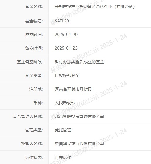 【大河财立方消息】1月24日消息,开封产投产业投资基金合伙企业(有限合伙)在中基协备案。